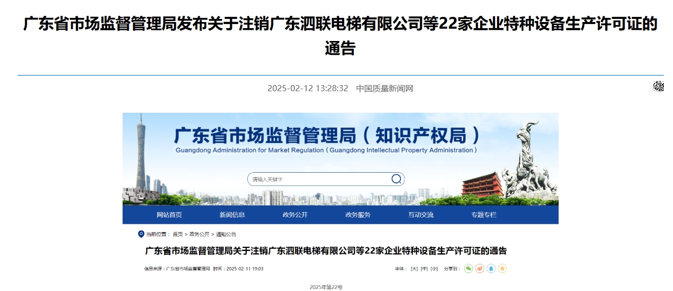 广东省市场监督管理局近日发布通告,宣布注销广东泗联电梯有限公司等22家企业的特种设备生产许可证。