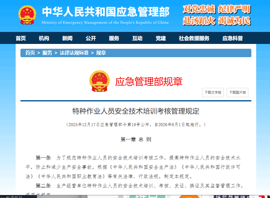 应急管理部近日发布第19号令,修订《特种作业人员安全技术培训考核管理规定》(以下简称《规定》),明确自2026年6月1日起取消特种作业操作证每3年复审1次的要求,改为每6年换证一次,并新增特殊原因延期换证制度。此次修订旨在优化服务流程、减轻从业人员负担,同时通过强化监管提升特种作业人员安全技术水平。