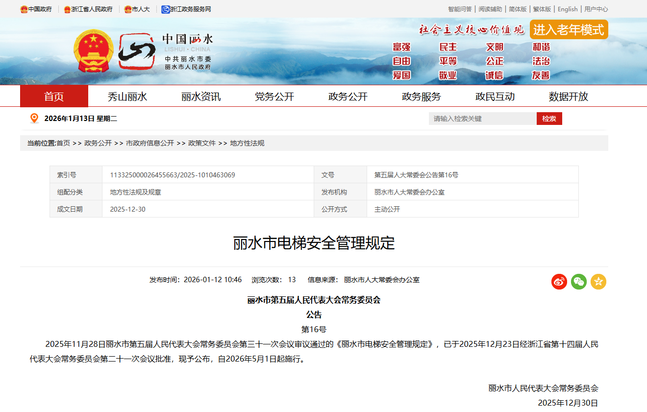 近日,丽水市第五届人民代表大会常务委员会第三十一次会议审议通过的《丽水市电梯安全管理规定》,经浙江省第十四届人民代表大会常务委员会第二十一次会议批准后正式公布,并将于2026年5月1日起正式实施。该规定旨在加强电梯安全管理,预防和减少电梯事故,保障市民人身和财产安全。
