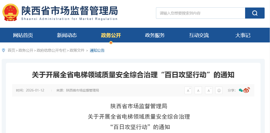 2026年1月9日,陕西省市场监督管理局发布《关于开展全省电梯领域质量安全综合治理“百日攻坚行动”的通知》,决定自即日起至4月30日,在全省范围内开展电梯全链条质量安全专项整治。这场覆盖制造、安装、使用、维保、检测、应急救援六大环节的攻坚战,将通过“查处、整改、规范、清理、退出、警示”六位一体举措,剑指行业顽疾,守护公众乘梯安全。