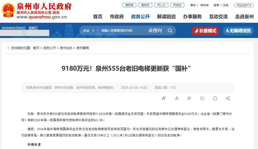 2026年2月5日,福建省泉州市住建局、发改委、财政局联合发布消息,泉州市共有555部住宅老旧电梯更新项目被纳入2026年第一批超长期特别国债资金支持范围,获补助资金9180万元,占全省(除厦门外)补助总额的43.2%,居全省前列。